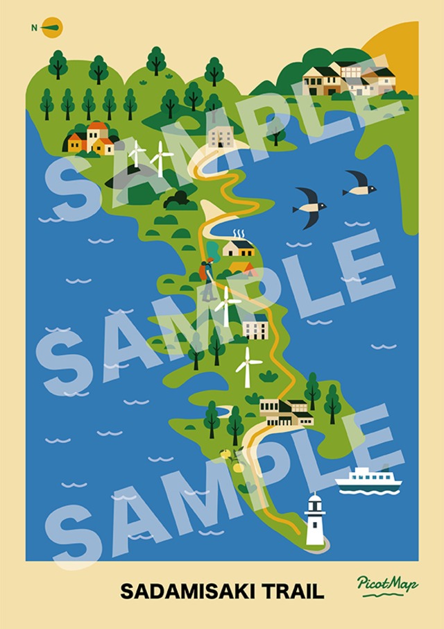 \山旅とアートのあいだにあるもうひとつの地図/ 四国・愛媛県の最西端に位置する「佐田岬半島」をテーマにしたイラストマップです。 日本一細長い半島に延びるえひめ佐田岬トレイルを、俯瞰スタイルのイラストで描きました。 風車が並ぶ丘、歴史ある港町、温泉、そして灯台まで、ピクトグラムで道や風景をわかりやすく表現しています。 歩いた人はもちろん、これから歩いてみたい人にもおすすめ。 自宅でのプリントやスマホ壁紙、ギフトとしても楽しめる一枚です。 【商品内容】 PicotMapオリジナル Vol.1 佐田岬トレイルマップ【Detail Route Type】 ロングトレイルコースや主要ランドマークを記したタイプ ・A4サイズのPDF(印刷・閲覧用) ・300dpi高解像度JPEG(端末閲覧用) ※お届けするデータには「SAMPLE」の透かしはありません。 【ご注意】 ・デジタル商品につき、返品・キャンセルはお受けできません。 ・購入者本人の個人利用に限りご使用いただけます。 ・複製・転載・商用利用は禁止しております。 【PicotMapとは】 PicotMap(ピコマップ)は、登山や自然の旅をテーマにしたイラスト地図ブランドです。 地図とアートのあいだにある、「見ることで旅を思い出せる」「登らなくても楽しめる」地図を目指しています。 【Detail Route Type】 Includes trail paths, main landmarks, and local road details for a more informative overview. Description: Explore the beauty of the Sadamisaki Peninsula in Ehime, Japan, through this hand-drawn illustrated map from PicotMap. Perfect for hikers, art lovers, and Japan enthusiasts. This map highlights the iconic Sadamisaki Lighthouse, Misaki Port, Kamegaike Onsen, and scenic wind turbine hills using gentle lines and playful pictograms. It’s a simplified, artistic take on the traditional topographic map—great for framing, gifting, or inspiring your next coastal adventure. What’s Included: PDF & JPEG files (high-resolution) Digital download – no physical item shipped Size: A4 (can be resized for printing) Features: Hand-drawn style with soft colors Highlights the trail route, local roads, and scenic points Ideal for home decor, trip planning, or souvenirs Note: This map is intended for visual enjoyment and general orientation. It is not designed for detailed navigation on the trail.